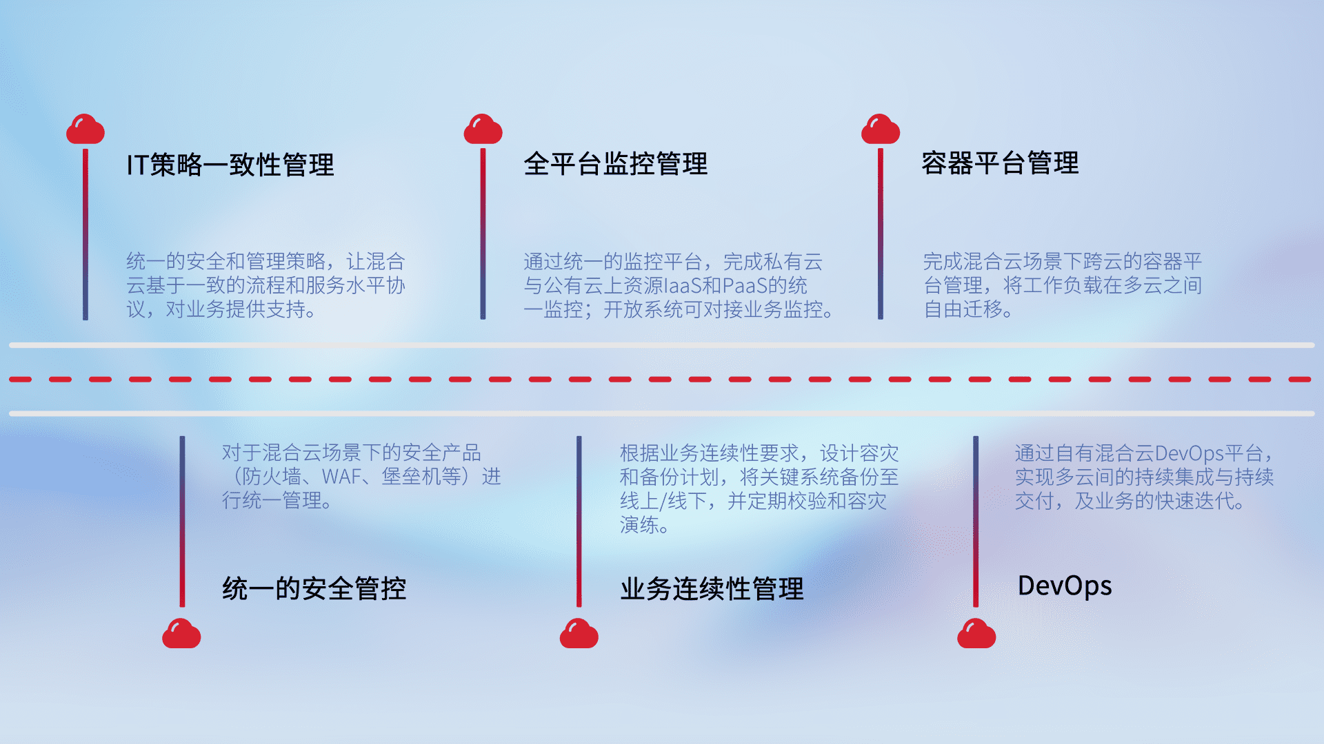 通过多云纳管,,以统一的资源数据模型把客户的云资源进行抽象和封装,,,进而实现对多云资源的统一操作,,,,保障云资源管理的可靠性、、稳定性与可用性。。。。量身定制化运维内容,,,,配置、、、开发运维、、、、补丁管理、、、、备份、、监控、、、、认证和访问管理、、、、审计和日常巡检等,,,,保障在用云过程中的可靠度,,,,稳定度以及高可用率。。。
